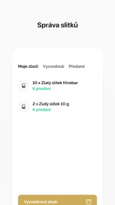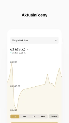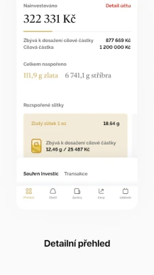 Ať už nakupujete jednorázově nebo spoříte v rámci komoditního účtu, v aplikaci vždy uvidite stav vašich nákupů, kolik Vám zbývá k dospoření aktuálně rozspořeného slitku nebo kolik gramů jste již celkem zakoupili. Po zakoupení nebo dospoření slitku si v aplikaci můžete také naplánovat vyzvednutí zboží na jedné z našich poboček, případně si vyžádat jeho zaslání poštou. V aplikaci můžete i sledovat aktuální ceny drahých kovů a nastavit si hlídacího psa, který vás upozorní, pokud cena Vámi zvoleného produktu dosáhne určité hodnoty. V neposlední řadě můžete díky aplikaci sledovat i zprávy z trhů, které pro Vás každý týden vydáváme a přihlásit se na některou ze vzdělávacícíh akcí, které pro Vás pravidelně pořádáme.